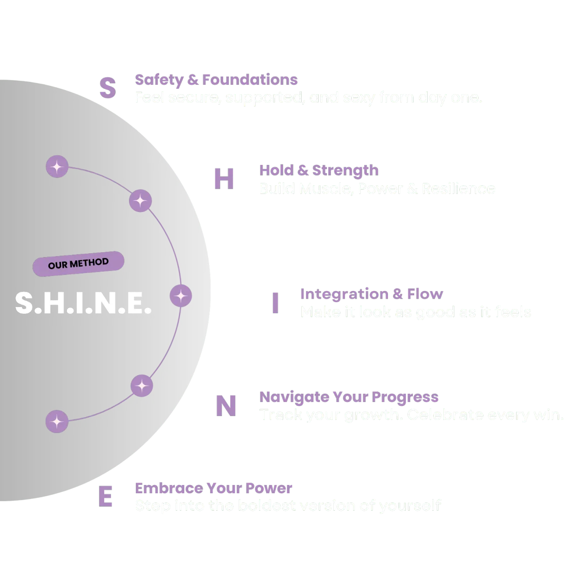 The S.H.I.N.E. Framework is our step-by-step blueprint for success. A clear pathway to help you grow stronger, more confident, and more skilled - no matter where youโre starting from.